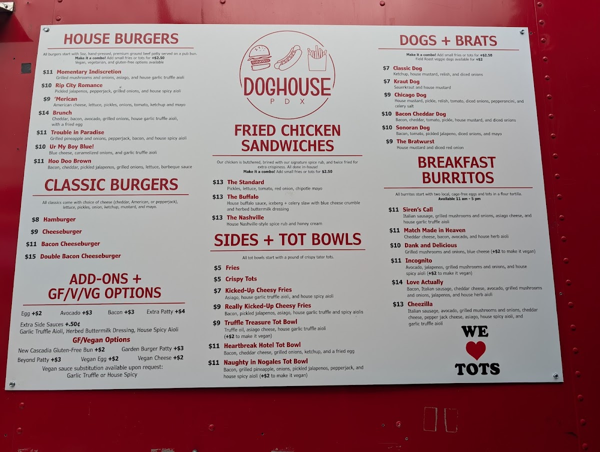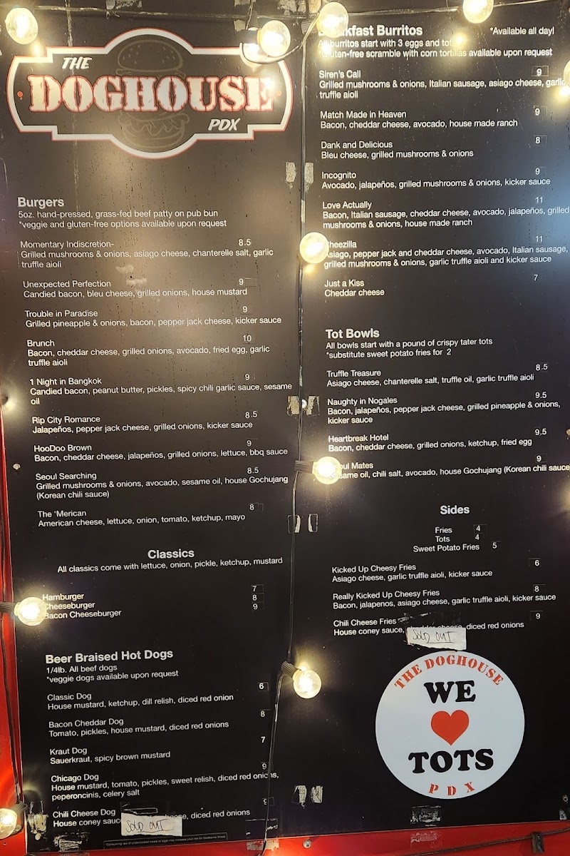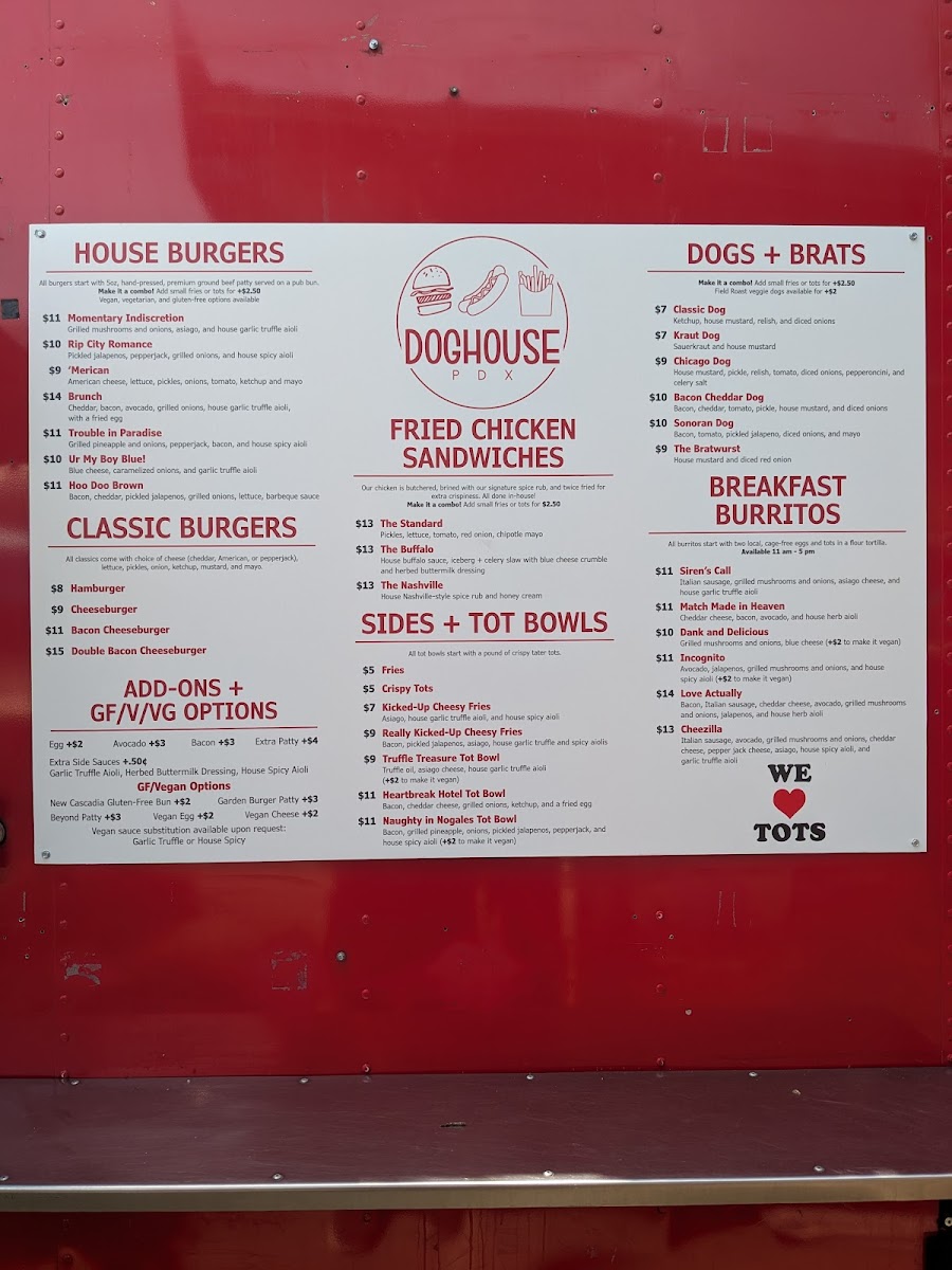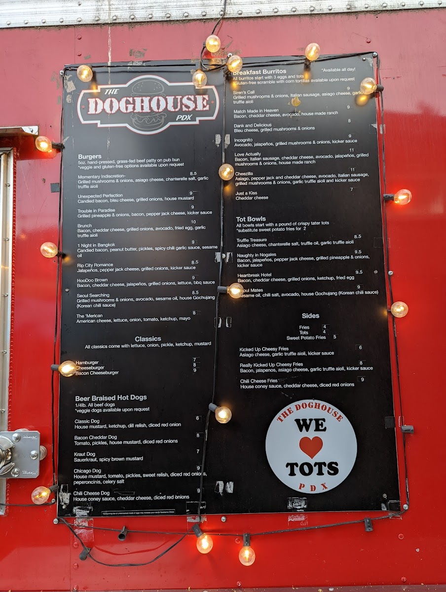 Located at 5029 SE Division St in Portland, The Dog House PDX is a delightful food cart pod that specializes in creating unforgettable comfort food. With its vibrant atmosphere and nearby beer bar, it’s the ideal spot to enjoy a satisfying meal. The menu predominantly features mouthwatering burgers, such as the 'Momentary Indiscretion,' known for its juicy grilled mushrooms, onions, and asiago cheese—a true crowd favorite. Customers rave about the Unexpected Perfection burger, laden with bacon and bleu cheese, making it a top pick for burger enthusiasts.